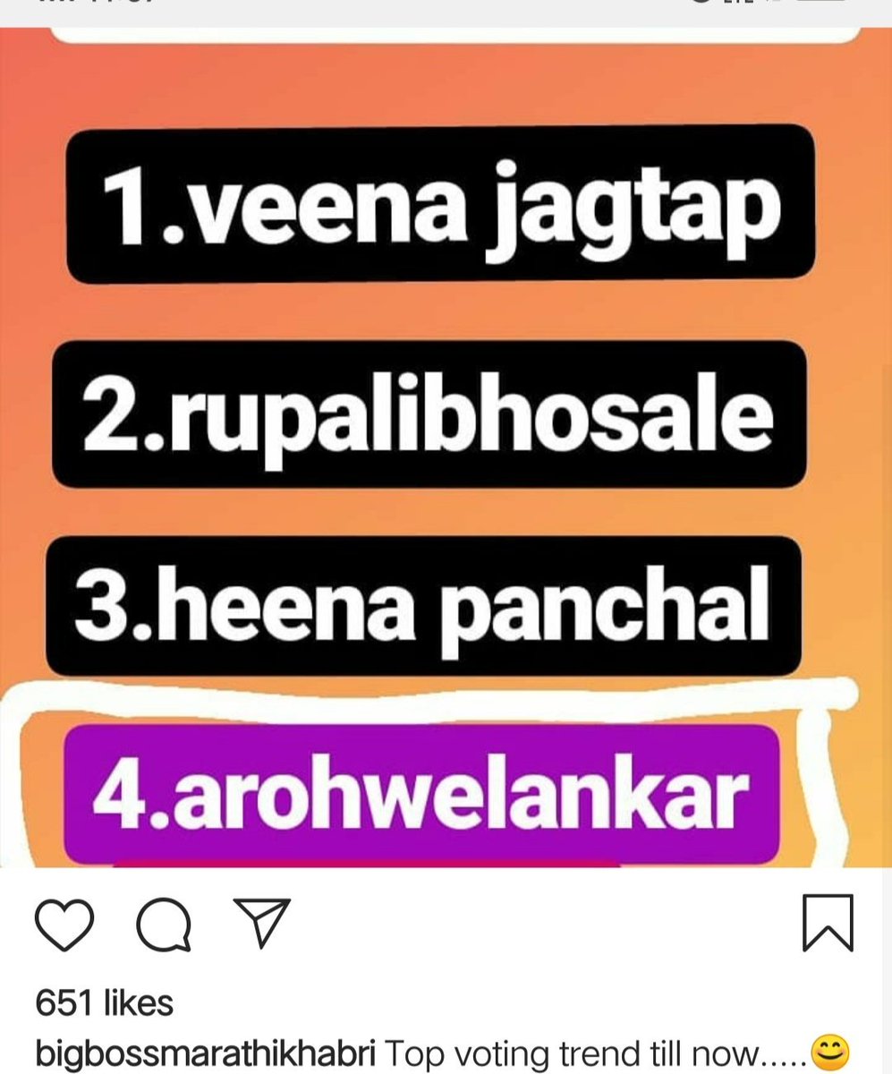 baki as per voting trend,aroh bottom la ahe.rupali at 3,heena at2 and veena at 1tya bichukale ani shivanila kadha,tyanchya mule je lok gharat first daypasun ahet tyanchavar injustice bot ahe.