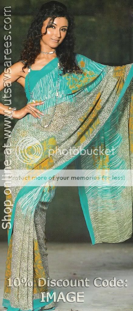 Prachi is going to get ready when she sees a blue sari on the bed with matching jewllery, and she realizes that neev brought is so she smiles and takes it, comes out he washroom wearing: