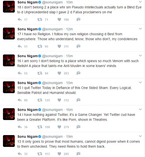 Sonu Nigam defends Abhijeet Bhattacharya; announces will quit TwitterSonu NigamVerified account @sonunigamFollowMoreSonu Nigam Retweeted Ved Tiwari