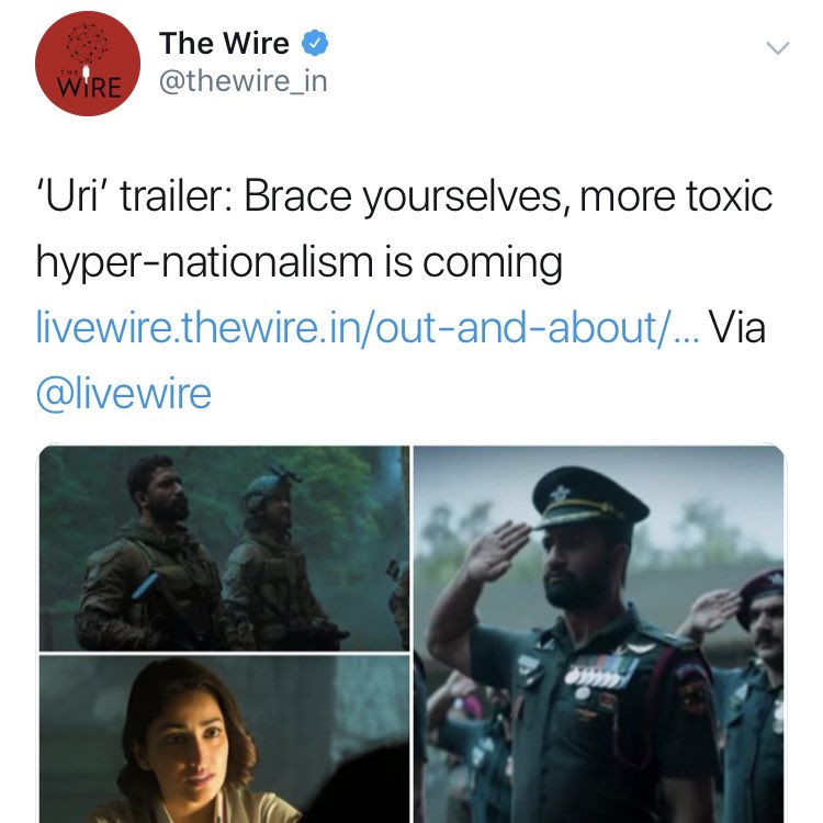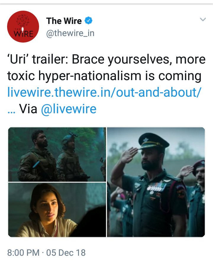 A movie that glorifies gangster Abdul Latif tells the spirit of the state but a movie that tells us about the bravery of our soldiers is toxic hyper-nationalism. Welcome to the world of WIRE 😆