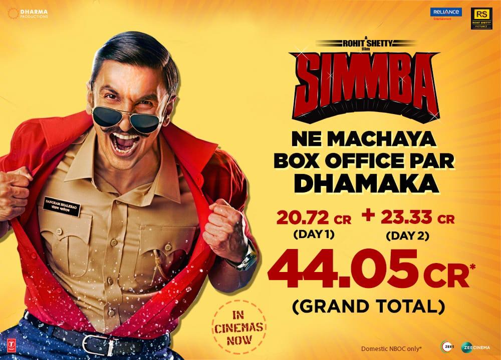 #Simmba roars on Day 2... While Mumbai circuit is exceptional, the other circuits that were slightly low on Day 1 have also picked up... Growth on Day 2 [vis--vis Day 1]: 12.60%... Expected to score big numbers today... Fri 20.72 cr, Sat 23.33 cr. Total: 44.05 cr. India biz.