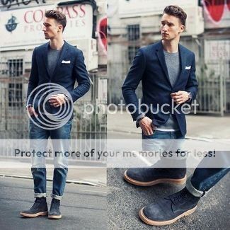 Was wearing blue jeans,grey t-shirt with blue blazer and desert boots
