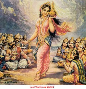 After the demi-gods and demons had churned the oceans to extract the nectar that would give them immortality, a fight over the possession of the urn containing the nectar ensued between them. Vishnu realised that if the squabble continued for long then the nectar would spill out and be lost forever. He also did not want the demons to drink any of the nectar, as that would firmly entrench the forces of evil in the world. Hence he appeared on the scene as Mohini, a woman of breath-taking beauty and allure. Both the demi-gods and the demons stopped fighting and began to ogle at her. Flaunting her charms, Mohini convinced both the demi-gods and the demons that she would distribute the nectar equitably.