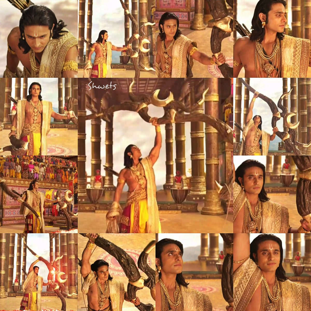 I take a few steps around the Dhanush, revering it. I feel the bow...its sanctity, its texture, its grandeur. In one swift motion, I lift it up...I set it up to tie it...and it breaks into two...