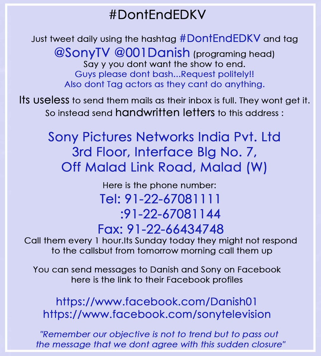 Tonite 9pm IST guys get Ready to trend in mass #DontEndEDKV Change location to India Start Drafting ur tweets now COPY & PASTE THE HASHTAG IF NEED BE #DontEndEDKV Do retweet other people's tweet TAG @SonyTV @001Danish