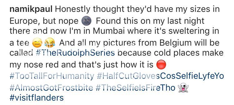 And those superrr amazing captions n hashtags ❤️I cant understand how can anyone even complain for those to-die-for captions!! I m a sucker for 'em.#TooTallForHumanity🤣Frost bite hmm tk cr handsomen well red nose is kinda too cute on you so no complains there ;)TFS Sneha :)