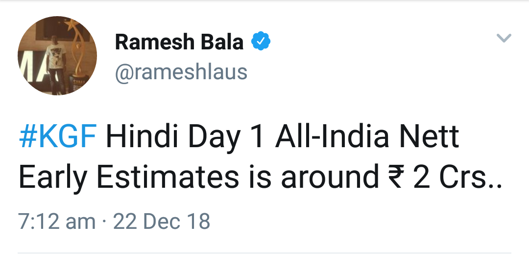 KGF is excellent business on all formats with second day collections of 19.25 crore nett across India. The film had a little drop in Karnataka but that is still great trending and is only behind Bahubali - The Conclusion in that state. The Hindi version had growth of 50% apprx which is good and it could sustain on the weekdays. Mumbai circuit might end up with good final numbers. The all india collections of the film are over 37 crore nett in two days.The approx first day figures of KGF are as follows.